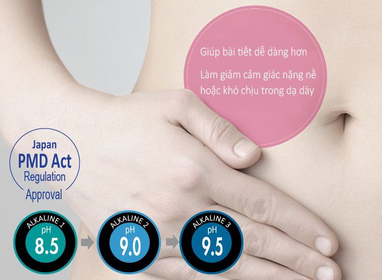 Nước ion kiềm đã được chứng nhận có hiệu quả về cải thiện các triệu chứng đường tiêu hóa theo quy định của Đạo luật về thiết bị y tế của Nhật Bản (PMD act)Uống khoảng 0.5 đến 1 lít nước ion kiềm mỗi ngày sẽ giúp bạn bài tiết dễ dàng hơn, làm giảm các cảm giác nặng nề hoặc khó chịu trong dạ dày, giúp hệ tiêu hóa khỏe mạnh hơn.