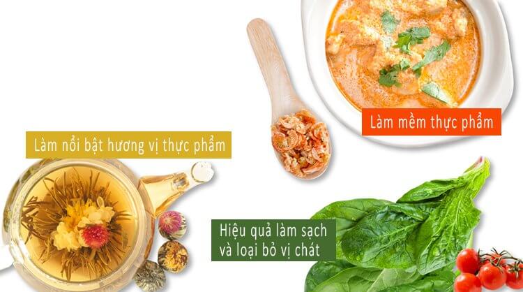NGON: Nước ion kiềm (pH 9.0 – 9.5) có cấu trúc phân tử nước siêu nhỏ giúp thẩm thấu qua thức ăn tốt hơn hẳn các loại nước khác, có tác dụng đặc biệt như chiết xuất nhiều hương vị hơn và làm thức ăn trở nên mềm hơn.
