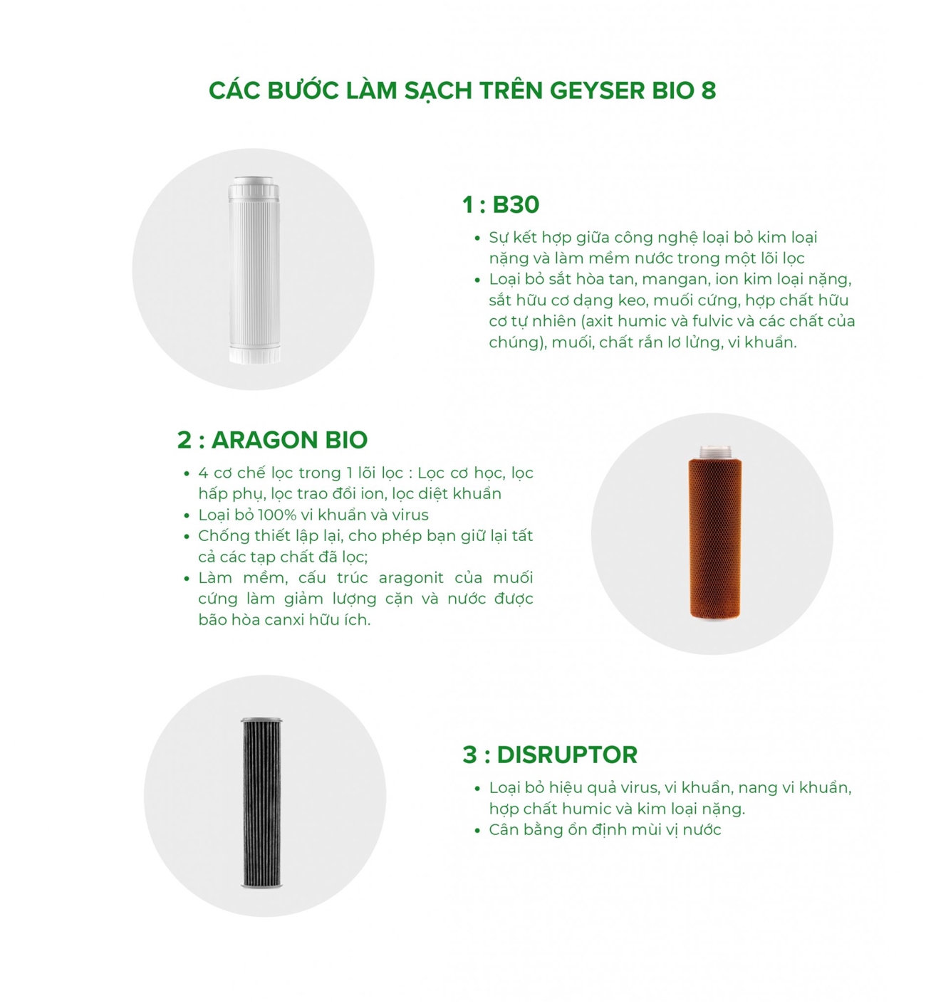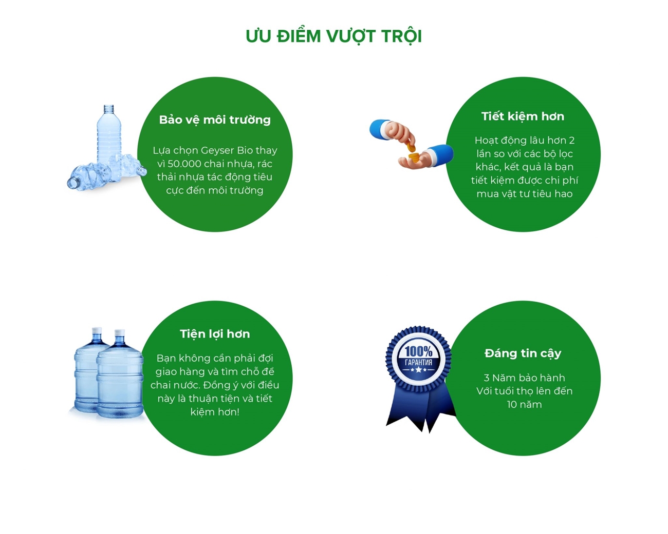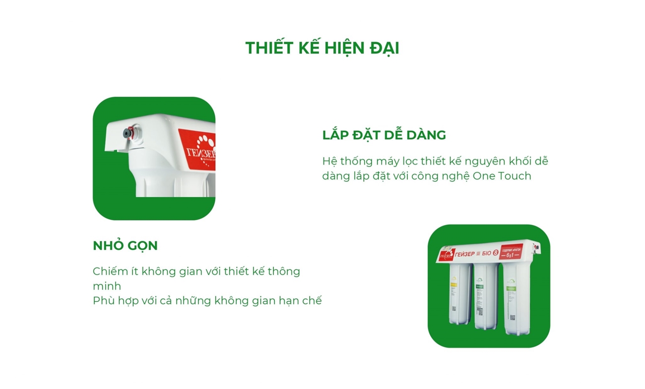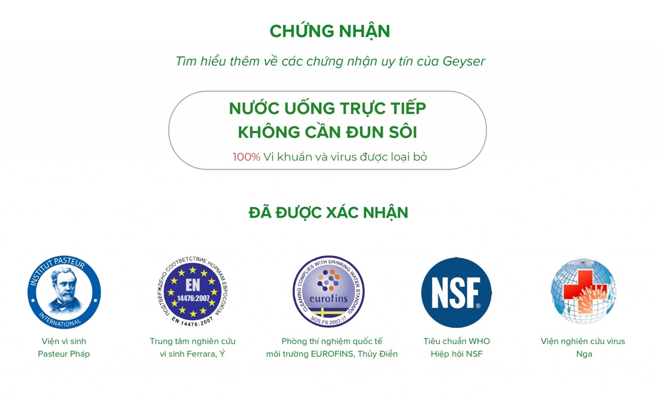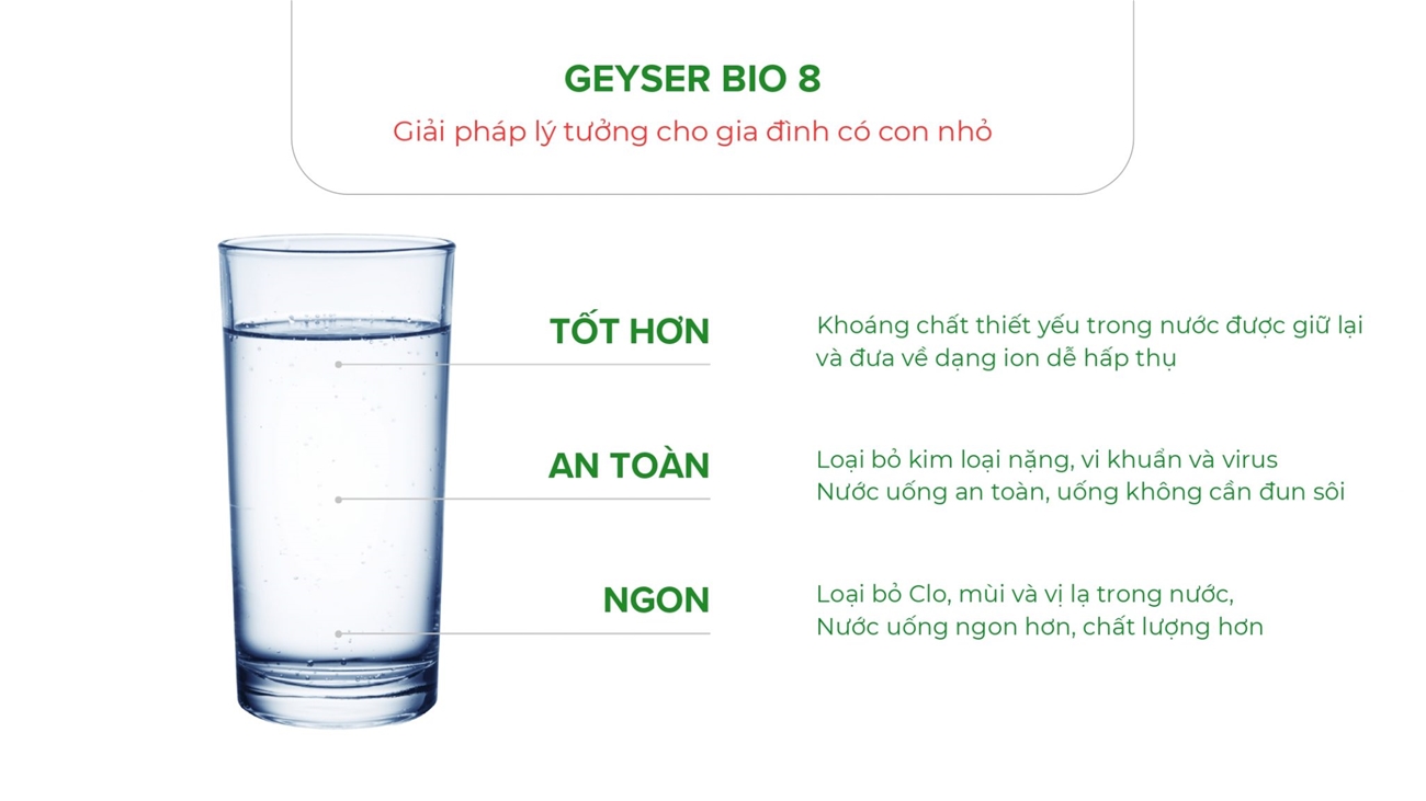 Geyser sản xuất hàng nghìn sản phẩm xử lý và lọc nước, được bán ở hơn 20 quốc gia trên thế giới. Mỗi ngày bộ lọc từ Geyser lọc hơn 100 triệu lít nước. Hơn 22 triệu người trên thế giới sử dụng sản phẩm lọc nước từ Geyser. Tại Việt Nam, Geyser đã có mặt hơn 15 năm, đã khẳng định được chất lượng và được rất nhiều người dân Việt Nam tin dùng.